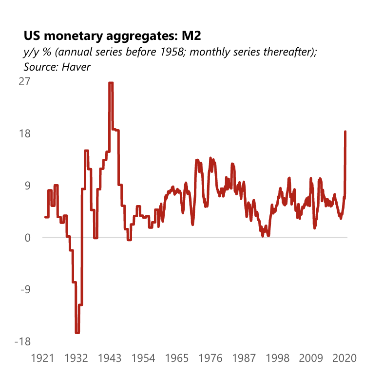 與央行資產(chǎn)負(fù)債表迅速擴(kuò)張相對應(yīng)的是貨幣總量的急劇膨脹。美聯(lián)儲(chǔ)數(shù)據(jù)顯示,美國的M2增速已達(dá)到1981年以來的最高峰,今年的增速有望達(dá)到二戰(zhàn)時(shí)期的最高水平。