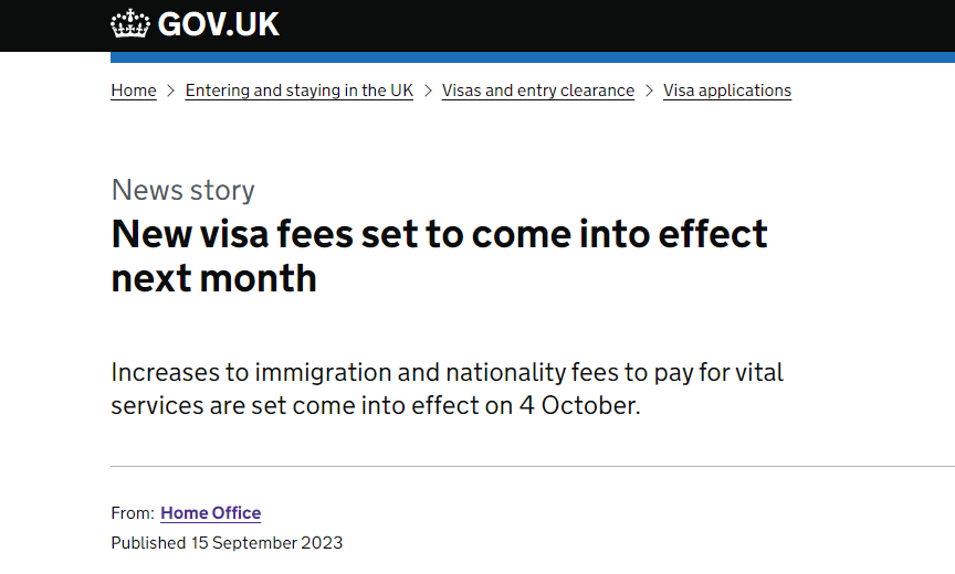 英國內(nèi)政部9月15日發(fā)布公告:自2023年10月4日起,英國旅游簽證、學(xué)生簽證及工作簽證等多項簽證費用全面上漲,不同簽證類型在英國境內(nèi)/境外的申請費用漲幅各異,下面我們具體看看都有哪些變化吧!也提醒近期有英國簽證辦理需求的小伙伴們,抓緊辦理哦!